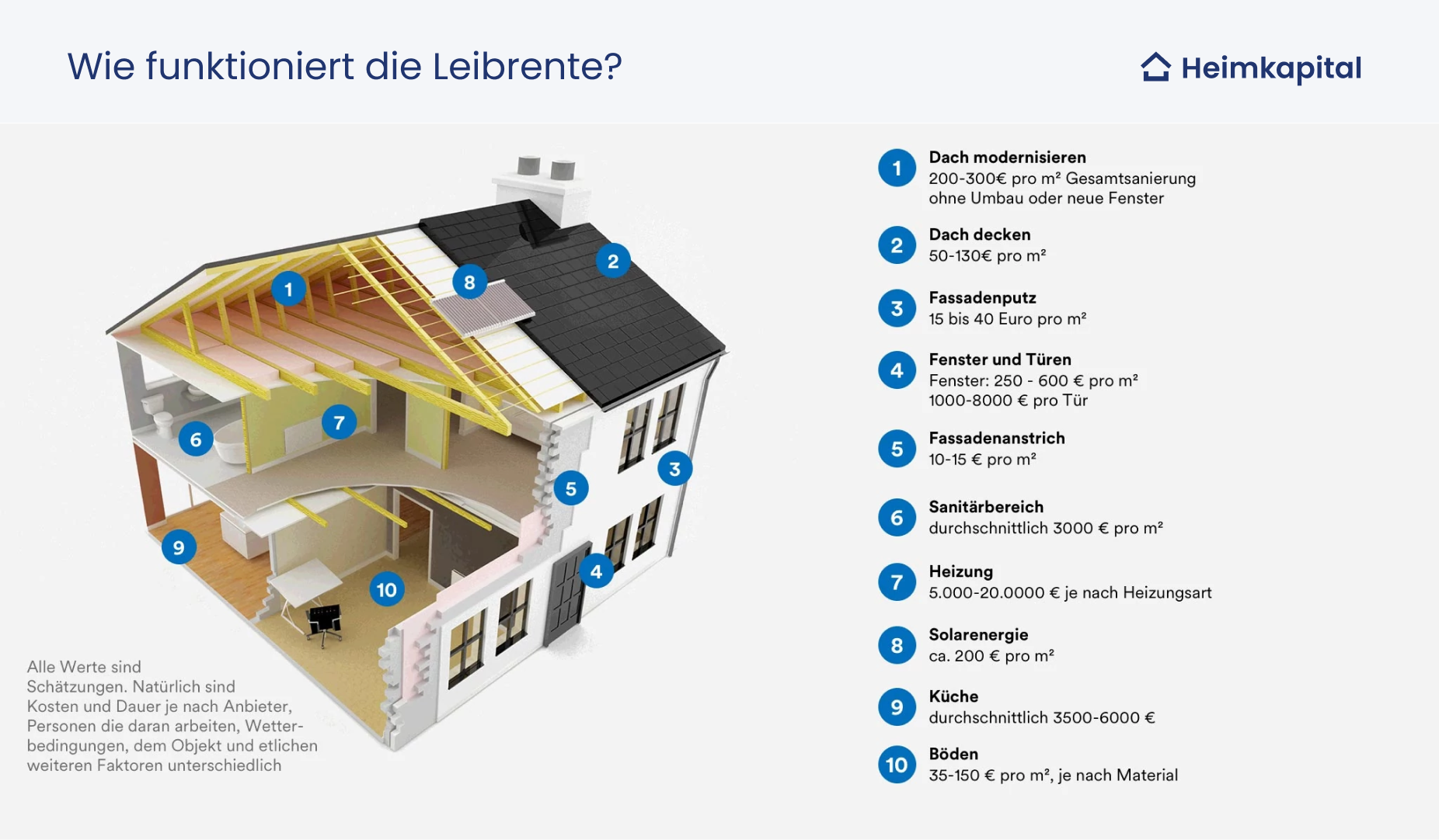Hier kann der Immobilien Teilverkauf eine intelligente Lösung sein. Im Gegensatz zur Leibrente und zur Umkehrhypothek können Sie sich auf ein klares Prinzip verlassen: Sie verkaufen einen Teil der Immobilie und erhalten dafür eine Sofortauszahlung. Dadurch benötigen Sie gar keinen Modernisierungskredit, um die notwendigen Maßnahmen durchführen zu können. So einfach und so transparent - ohne die lästigen Diskussionen um einen Modernisierungskredit.